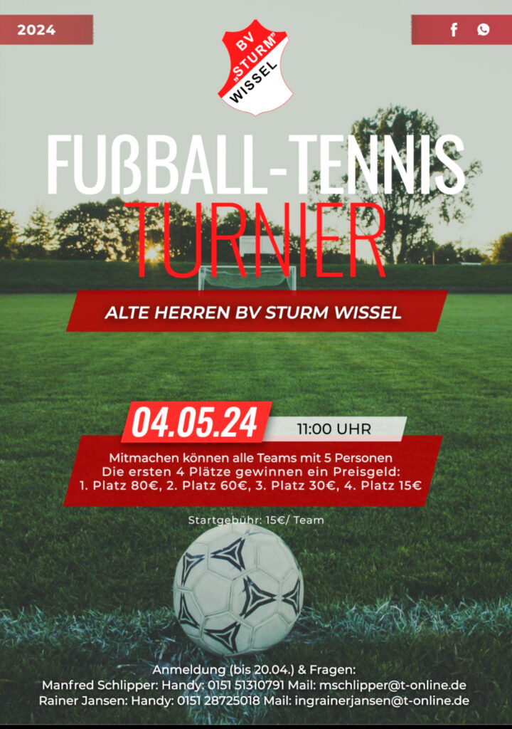 Die Alten Herren des BV Sturm Wissel veranstalten auch in diesem Jahr wieder ihr traditionelles Fußballtennisturnier. Seit Jahrzehnten ist dieses Event ein fester Bestandteil der Wisseler Veranstaltungen und erfreut sich sowohl bei den Teilnehmern als auch bei den Zuschauern großer Beliebtheit.