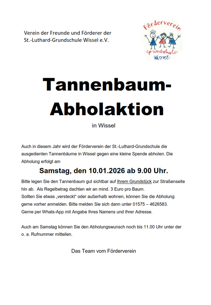 Auch in diesem Jahr wird der Förderverein der St.-Luthard-Grundschule die ausgedienten Tannenbäume in Wissel gegen eine kleine Spende abholen. Die Abholung erfolgt am Samstag, den 10.01.2026 ab 9.00 Uhr. Bitte legen Sie den Tannenbaum gut sichtbar auf Ihrem Grundstück zur Straßenseite